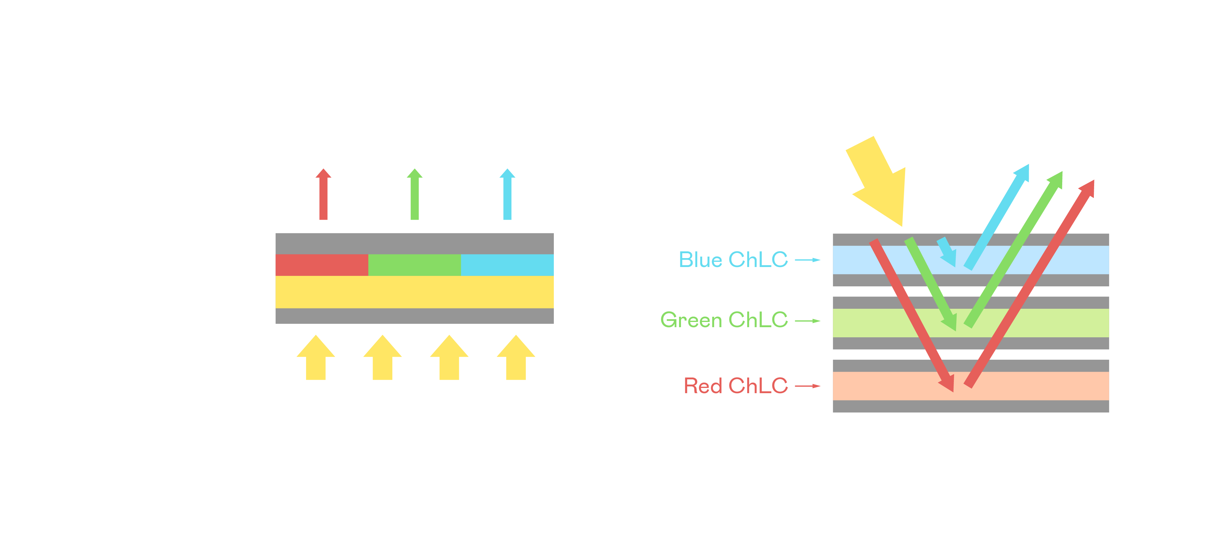 彩虹多多胆固醇液晶显示器是由红、绿、蓝三层胆固醇液晶面板堆叠而成,并采用无彩色滤光片设计,减少环境光在反射过程中的损耗。